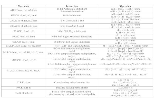 "The custom instructions are tailored to the needs of 8/16/32-bit integer complex arithmetic typically required by quadrature modulations. The proposed extension occupies only two major opcodes and most instructions are designed to come at a near-zero energy cost."