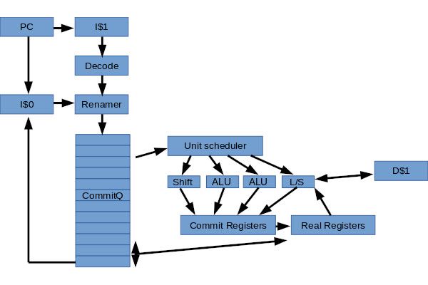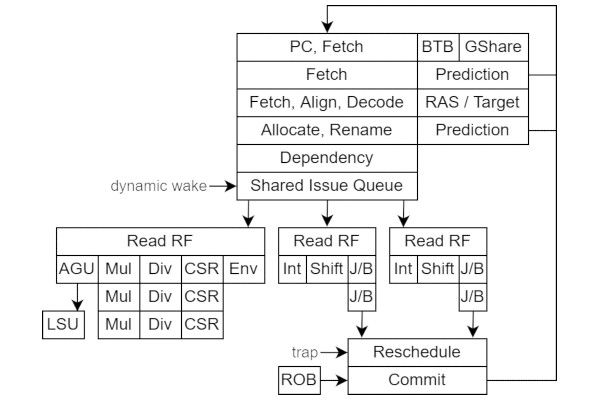 The core design is out-of-order, super-scalar, and with speculative execution, with a goal of an eight IPC peak dropping to around four IPC for ALU-heavy operations. It supports multi-core implementations with two-way simultaneous multithreading, and while described as a work-in-progress has already hit the point of being able to boot Linux on an AWS-FPGA instance.