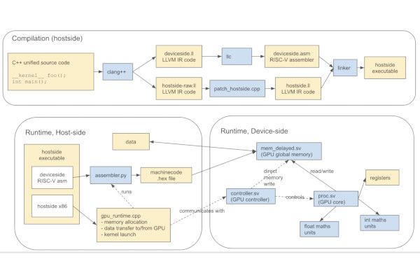 The core design goal for the project is a core capable of running workloads written for the Heterogeneous-compute Interface for Portability (HIP), and hopefully boasting compatibility with the PyTorch deep-learning framework. Support for additional programming interfaces, including SYCL and CUDA, aren't a focus - but, Hugh says, he's open to their implementation.